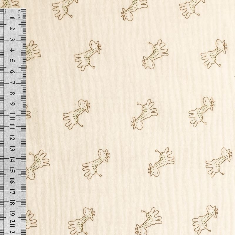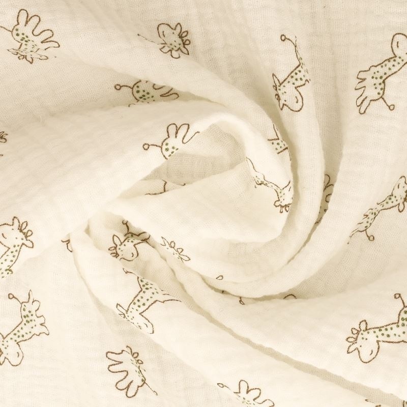 Apportez une touche de délicatesse à vos créations avec ce tissu en double gaze de coton orné d’un motif girafe dans des tons doux et apaisants. Légère et aérienne, la double gaze est appréciée pour sa texture naturellement froissée et son incroyable douceur au toucher. Ce tissu est idéal pour des vêtements confortables comme des blouses, des robes ou des accessoires pour enfants, mais aussi pour de la décoration légère : coussins, langes ou plaids d’été.