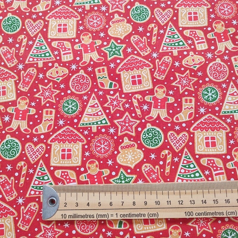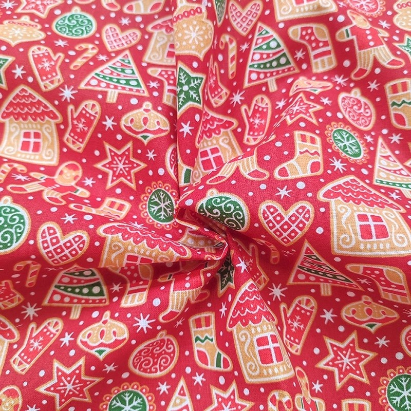 Le tissu Petit biscuit est imprimé d'un motif sur le thème de noël sur un fond rouge et sur une base 100% coton. Il apportera une touche festive et originale à votre décoration. Idéal pour réaliser une nappe, un calendrier de l’Avent ou un chemin de table, ce tissu imprimé s’adapte à toutes vos créations.
