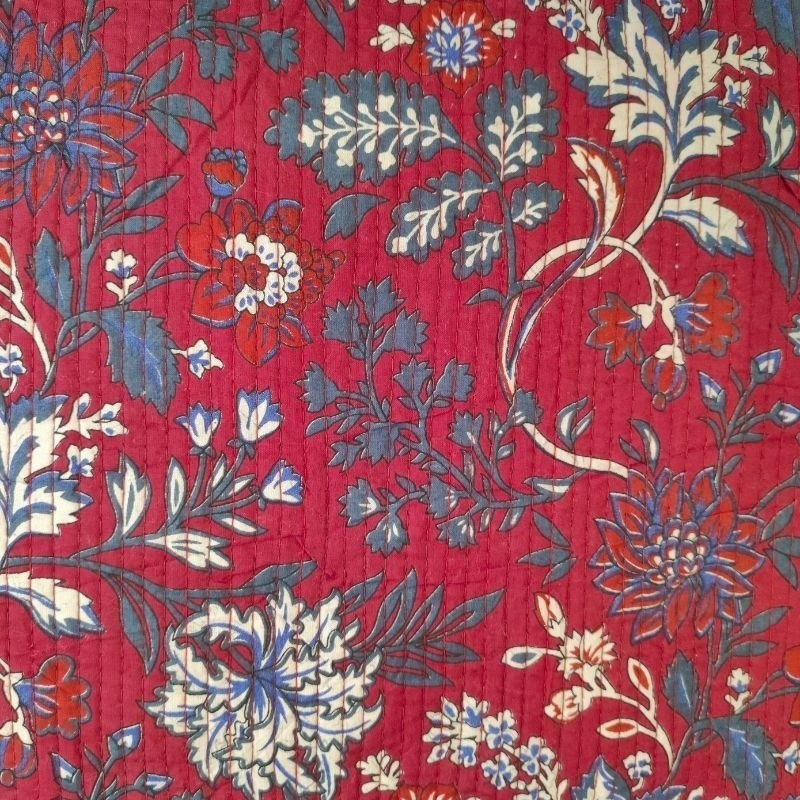 Découvrez ce tissu blockprint matelassé 100% coton double face, orné d'un magnifique motif végétal et floral rouge et bleu. Les motifs sont imprimés à la main avec des tampons.Ce matelassé apporte de l'authenticité et de l'élégance à vos projets de couture décoration intérieure, ou créations vestimentaires...