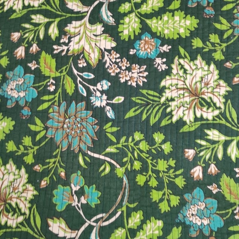 Découvrez ce tissu blockprint matelassé 100% coton double face, orné d'un magnifique motif végétal et floral vert et jaune. Les motifs sont imprimés à la main avec des tampons.Ce matelassé apporte de l'authenticité et de l'élégance à vos projets de couture décoration intérieure, ou créations vestimentaires...