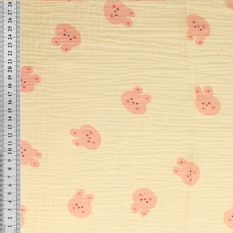 Apportez une touche de délicatesse à vos créations avec ce tissu en double gaze de coton orné d’un adorable motif lapin dans des tons doux et apaisants. Légère et aérienne, la double gaze est appréciée pour sa texture naturellement froissée et son incroyable douceur au toucher. Ce tissu est idéal pour des vêtements confortables comme des blouses, des robes ou des accessoires pour enfants, mais aussi pour de la décoration légère : coussins, langes ou plaids d’été.