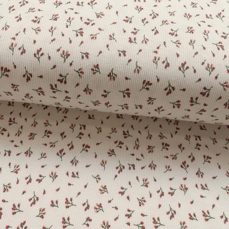 A la fois confortable et extensible le jersey côtelé fleurs sur un fond écru conviendra pour toutes vos confections de vêtements comme des tee-shirts.