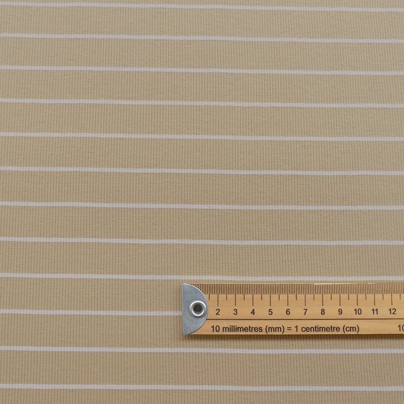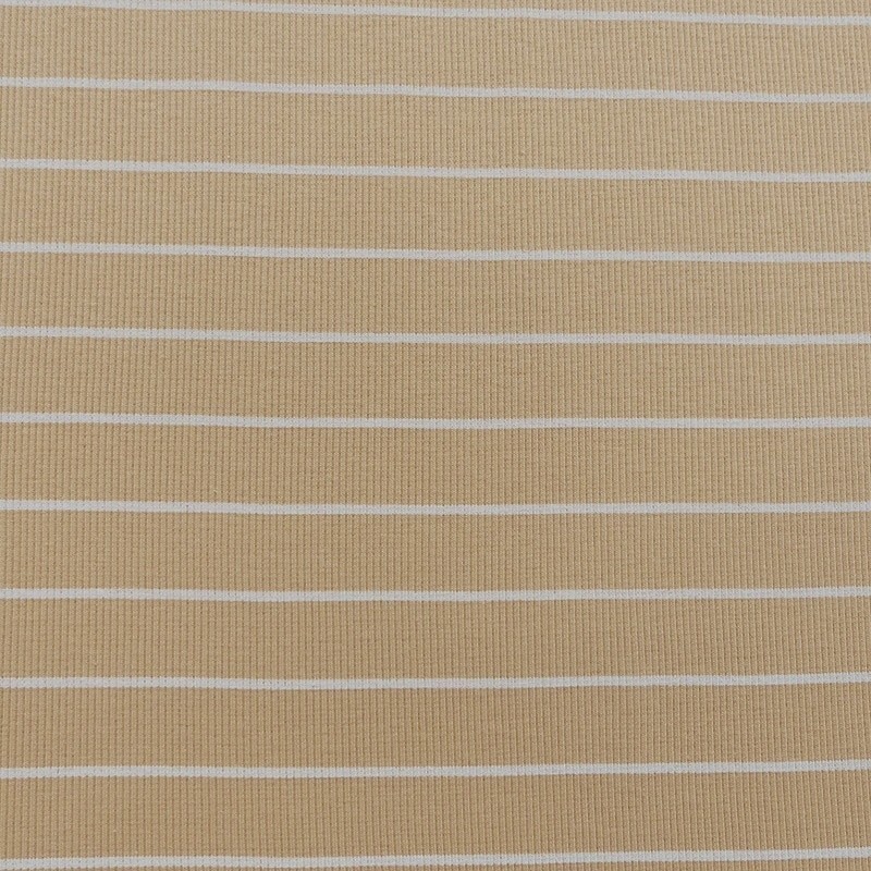 A la fois confortable et extensible le jersey côtelé rayé sur fond beige conviendra pour toutes vos confections de vêtements comme des tee-shirts.