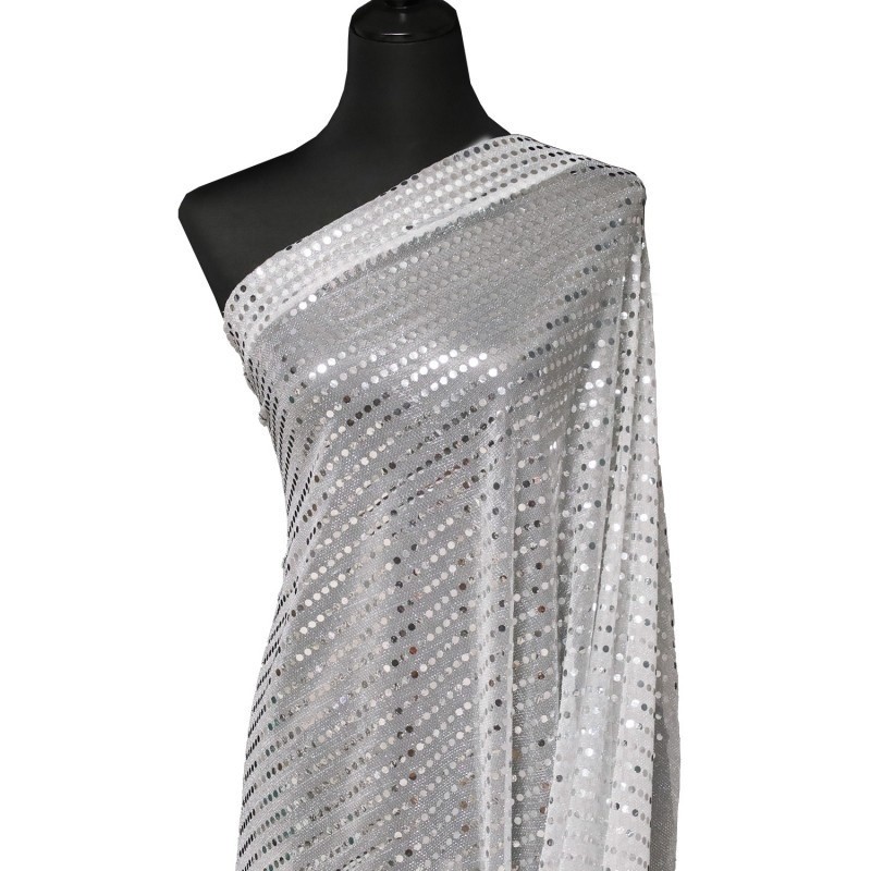 Offrez à vos créations une allure éclatante avec notre tissu paillettes sur voile argent. Conçu sur un voile scintillant argent, ce tissu est entièrement rehaussé de paillettes parfaitement assorties à la couleur du support, créant un rendu harmonieux, homogène et irrésistiblement brillant. La combinaison du voile léger, au mouvement fluide, et des paillettes argentées ton sur ton est idéale pour sublimer la lumière. Parfait pour la réalisation de robes de soirée, tenues événementielles, costumes artistiques, accessoires glamour ou éléments décoratifs haut de gamme.