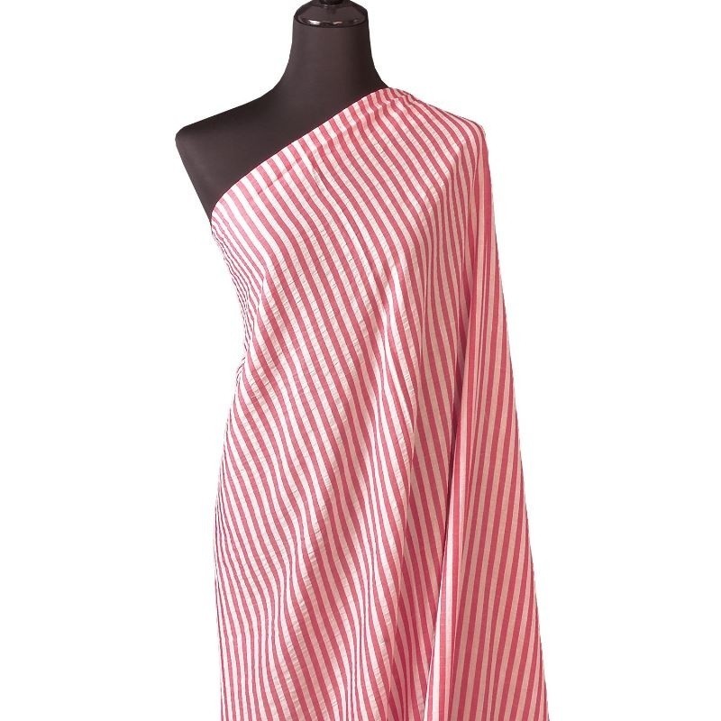 Cette étamine tissé-teint se distingue par sa légèreté et sa main souple. Ce tissu au tombé aérien est idéal pour les vêtements estivaux. Le motif à fines rayures coloris fuchsia, obtenu par un tissage teint fil, offre un rendu subtil et élégant, avec une excellente tenue des couleurs et une grande durabilité dans le temps. Les rayures régulières structurent le tissu tout en conservant une esthétique légère et contemporaine. Polyvalente, cette étamine convient parfaitement à la réalisation de chemisiers, robes légères, tuniques, voiles, ou détails de mode nécessitant finesse