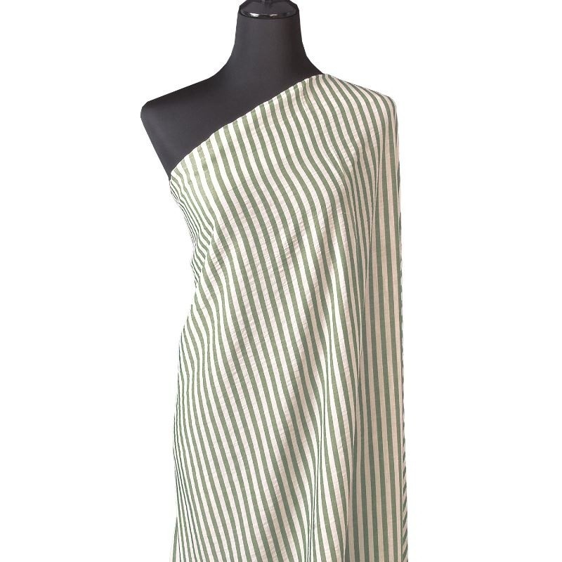 Cette étamine tissé-teint se distingue par sa légèreté et sa main souple. Ce tissu au tombé aérien est idéal pour les vêtements estivaux. Le motif à fines rayures coloris vert nil, obtenu par un tissage teint fil, offre un rendu subtil et élégant, avec une excellente tenue des couleurs et une grande durabilité dans le temps. Les rayures régulières structurent le tissu tout en conservant une esthétique légère et contemporaine. Polyvalente, cette étamine convient parfaitement à la réalisation de chemisiers, robes légères, tuniques, voiles, ou détails de mode nécessitant finesse