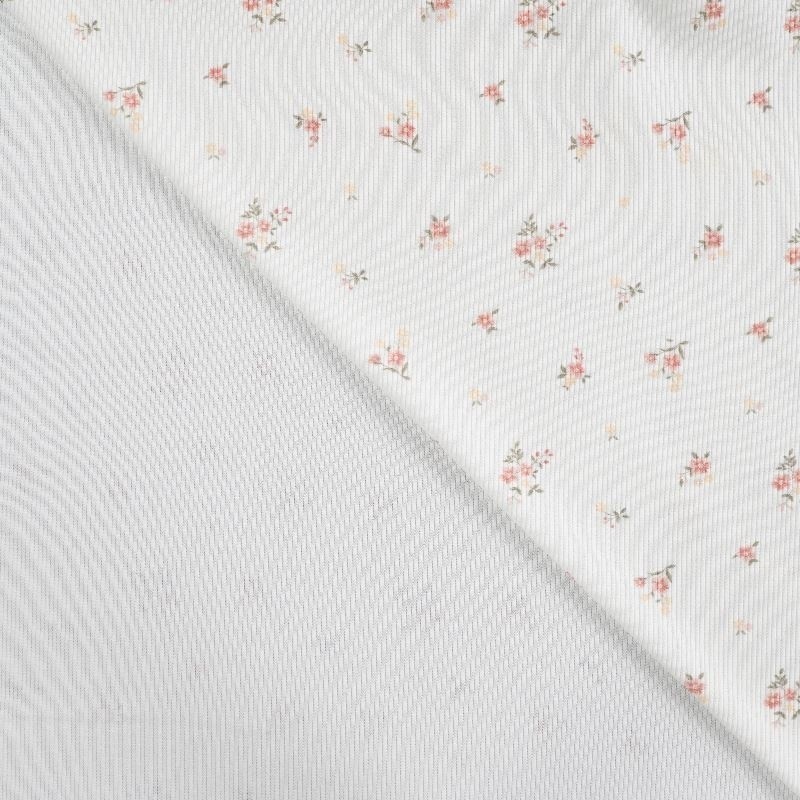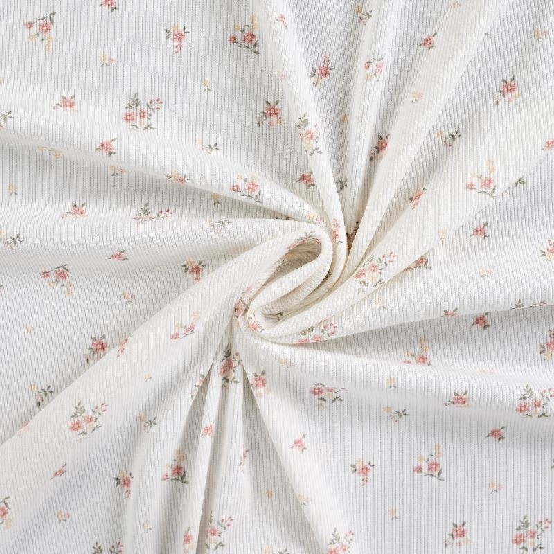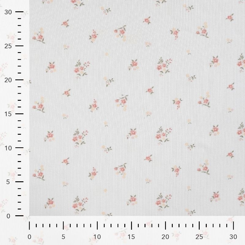 A la fois confortable et extensible le jersey côtelé imprimé d'un motif fleur sur fond écru conviendra pour toutes vos confections de vêtements comme des tee-shirts.