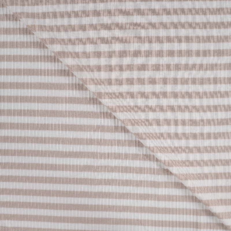 Ce tissu jersey de coton rayé coloris sable est un incontournable pour la confection de vêtements confortables et modernes. Composé de 95% coton et 5% élasthanne, il offre une excellente élasticité, une grande douceur au toucher et un très bon maintien. Avec son grammage de 200 g/m², ce jersey présente une belle tenue tout en restant souple et agréable à porter.