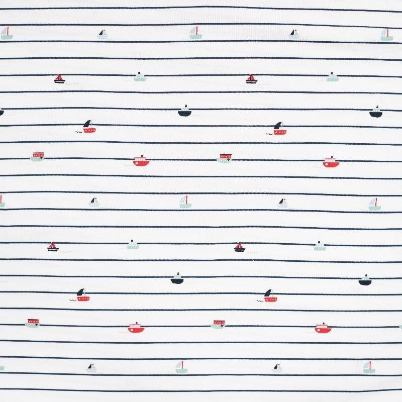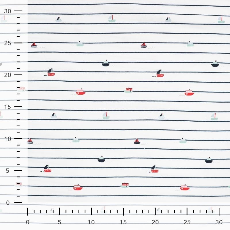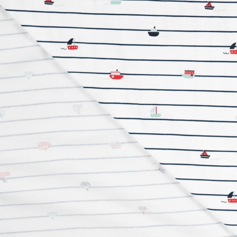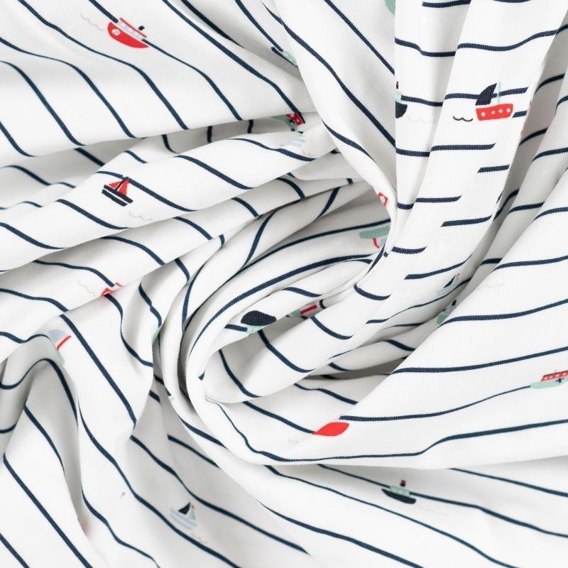 Ce tissu jersey de coton imprimé d'un motif bateau sur un fond rayé est un incontournable pour la confection de vêtements confortables et modernes. Composé de 95% coton et 5% élasthanne, il offre une excellente élasticité, une grande douceur au toucher et un très bon maintien. Avec son grammage de 200 g/m², ce jersey présente une belle tenue tout en restant souple et agréable à porter.