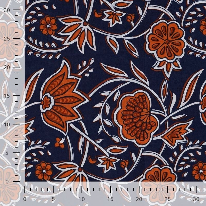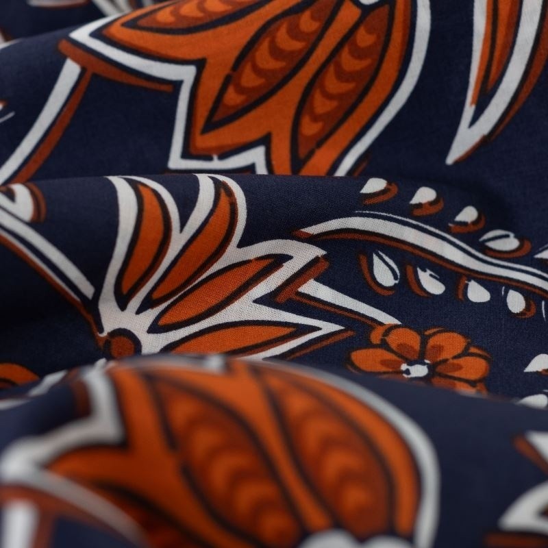 Le voile de coton est une matière agréable à porter car elle est douce et légère. Ce tissu imprimé de fleurs coloris cognac sur un fond marine peut-être utilisé pour la confection de vêtements légers comme des chemisiers ou pour des robes à doubler.