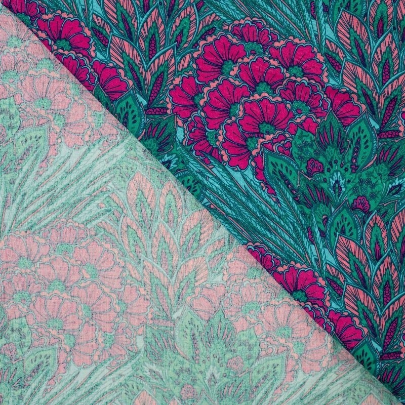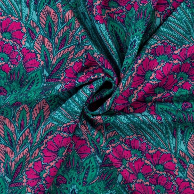 Ce tissu viscose avec un motif floral coloris pétrole à l'aspect satiné convient pour la confection de jupes, de robes ou encore de pantalons.