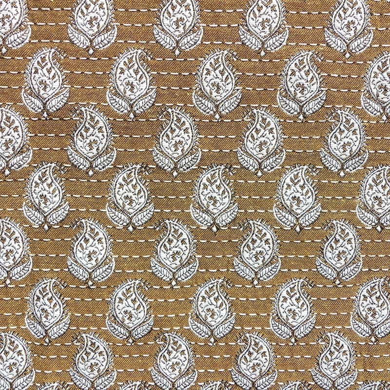 Le coloris curry, chaleureux et lumineux, apporte une touche d’exotisme et de modernité à l’ensemble. Les fleurs, finement dessinées dans le tissage jacquard, offrent du relief et une belle profondeur visuelle, tandis que le fond en pointillé ajoute une dimension graphique discrète mais structurante.
